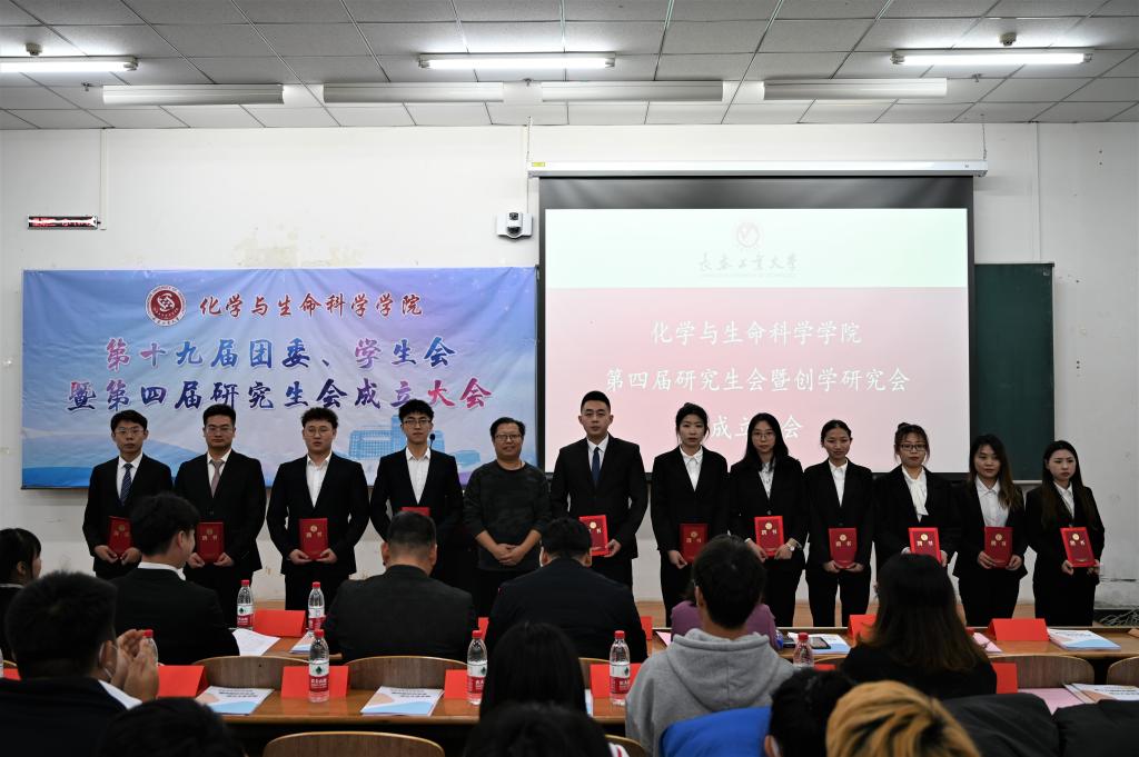 大会在庄严的国歌声中拉开序幕。首先由院团委书记张鹏老师宣读化学与生命科学学院新一届研究生会学生干部成员名单和第十九届团委、学生会学生干部成员名单。研究生大会首先由第三届主席马金鹏和第四届主席谭舒丰分别进行工作总结和工作展望,他们表示在过去的一年里,院研究生会在学院领导的正确指引下取得了较为优异的成绩,新一届的学生干部也会继往开来,再接再厉;紧接着,第十九届团委和学生会成立大会由第十八届学生团委副书记郭巾玲和学生会执行主席韩晶鹏先进行工作总结,他们讲述了在一年的工作中,我院全面推进团学改革,团学组织充分发挥桥梁纽带作用。随后,第十九届学生团委副书记赵哲和学生会主席单振华分别代表第十九届团委和学生会进行工作展望,希望在接下来的工作中能继承并发扬团学优良传统,深刻领悟习近平总书记重要讲话精神,在大学生思想引领、学生会自身建设等领域,寻求新突破,实现新发展。而后各学生干部进行宣誓,参会老师为学生干部颁发聘书并合影留念。