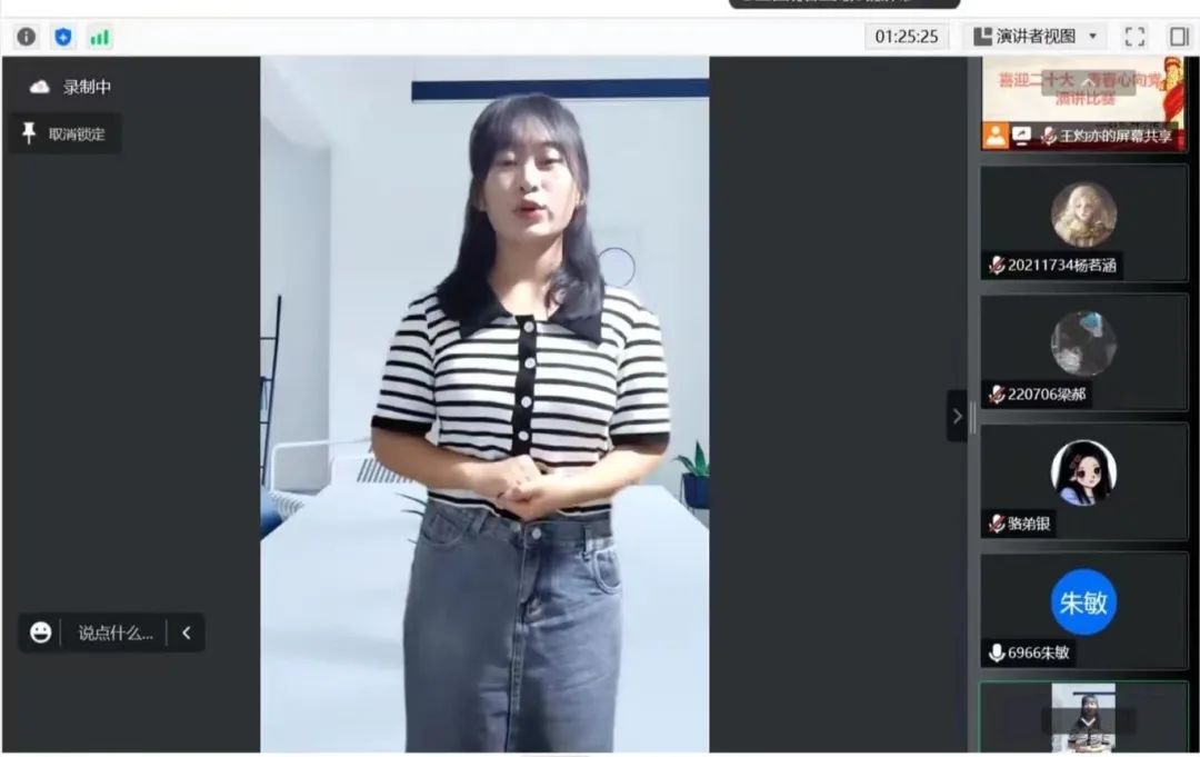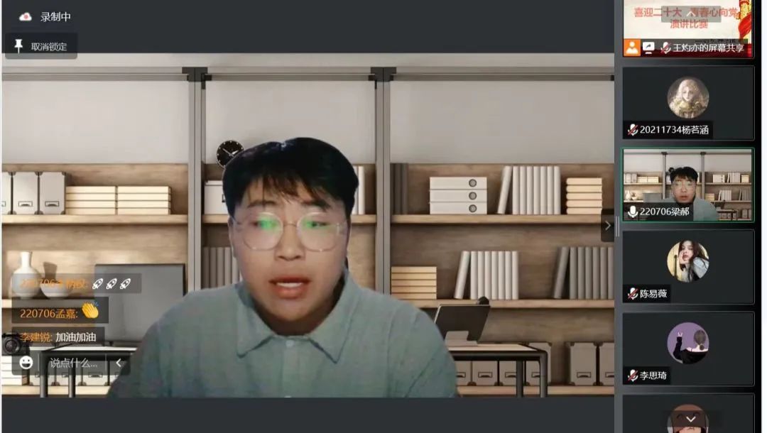 新闻网讯(通讯员 马静)为了营造活跃和谐的学院文化氛围,积极推动我院精神文明建设,展现新生们的良好风貌,厚植爱国主义情怀,我院于9月12日举办“喜迎二十大·青春心向党”演讲比赛,本次比赛采取“云演讲”形式,2022届全体同学参加了此次比赛。