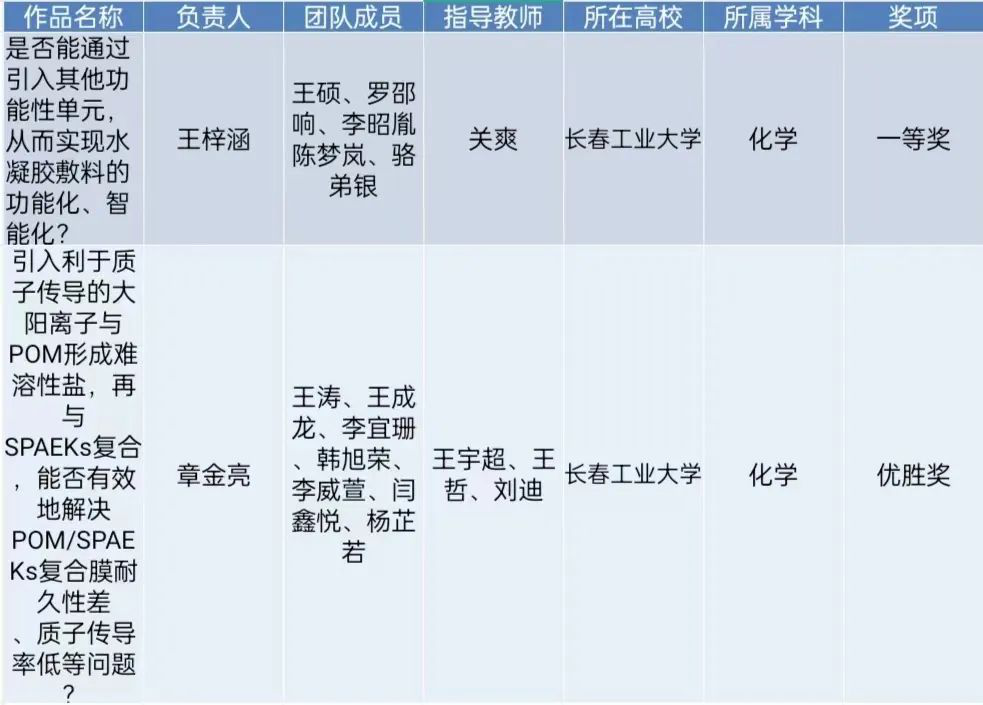 911日,由吉林省教育厅主办的首届吉林省基础学科拔尖学生提问与猜想活动拟获奖名单公布,经高校推荐、专家评审、组委会研究,拟授予 3 项作品特等奖、8项作品一等奖、15 项作品二等奖、22 项作品优胜奖。由我院关爽老师指导、王梓涵等同学完成的《是否能通过引入其他功能性单元,从而实现水凝胶敷料的功能化,智能化?》获得一等奖,王宇超老师指导、章金亮等同学完成的《引入利于质子传导的大阳离子与POM形成难溶性盐,再与SPAEKs复合,能否有效地解决POM/SPAEKs复合膜耐久性差、质子传导率低等问题?》荣获优胜奖!