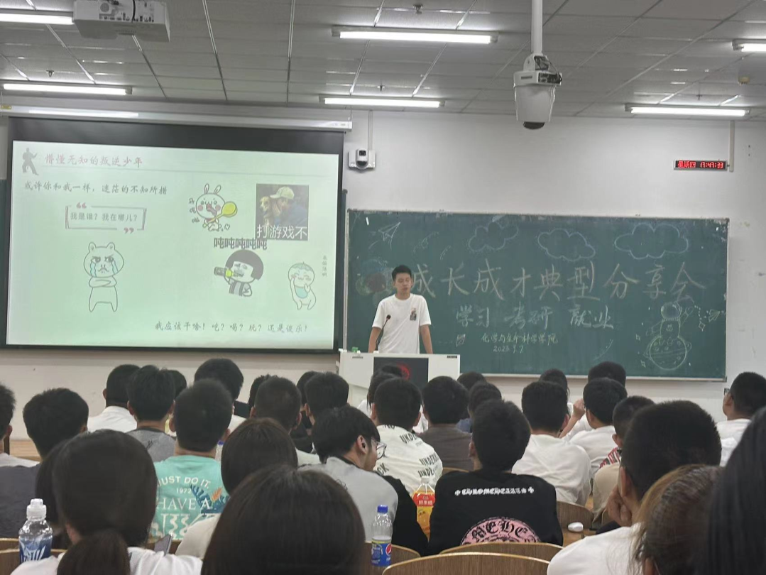 在大学期间荣获各种竞赛课题奖项的刘浩学长向大家展示了自己的科研成果,同时他也是“全寝7人全部保研”的主人公之一,他向学弟学妹们介绍了在大学中积极参加各类竞赛的重要性,讲述了自己的心路历程,他告诉大一新生要有“咬定青山不放松”的韧劲”和“不破楼兰终不还”的执着气息,定会取得自己理想成绩!