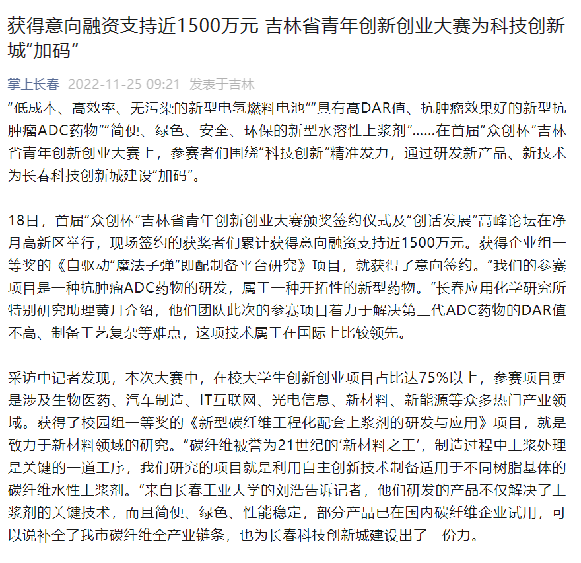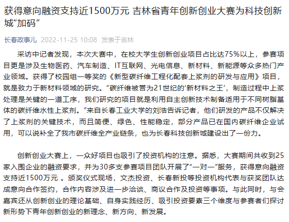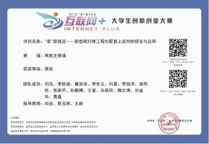 探索创新梦,锐意求进取,在科创竞赛领域,该同志结合吉林省碳纤维应用领域痛点问题,将所学知识应用于实践中,并且在实践中不断思考,解决实际问题。截至今日,该同志作为项目负责人累计获得第十八届“挑战杯”全国大学生课外学术科技创新竞赛二等奖,第九届中国大学生高分子材料创新创业大赛,第六届中国复合材料学会大学生科技创新竞赛二等奖等国家级奖项6项;获2022“挑战杯”吉林省大学生创业计划竞赛,第八届“互联网+”吉林省大学生创新创业大赛银奖,吉林省青年创新创业大赛一等奖等省级奖项6项;校级奖项20余项,在科创报国中镌刻最亮“人生印记”。在该同志的模范带头引领下,院内同学的参赛热情大幅提高,同学们的锐意创新、勇于实践的创新精神得到锻炼,贯彻落实了“以赛促学”的育人理念。该同志所负责的“浆”心独运团队,为解决社会重大刚需问题提供了重要的解决方案,相关成果也被长春日报,掌上长春等媒体报道。