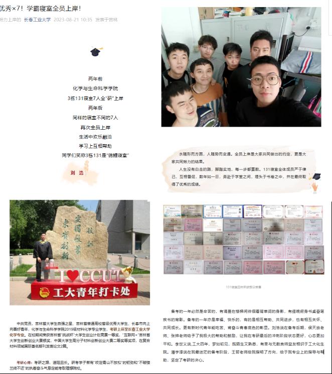 本科期间,该同志累计获得学业奖学金5次,科技创新奖学金3次;并荣获科研标兵、学风建设突出贡献个人等称号。综合成绩排名学年前30%。作为一名大学生,自2019年入学以来,他始终牢记以学业为重的职责,在不断丰富课外活动的同时,始终将学习放在首要位置。水随形而方圆,人随势而变通。他所在的131寝室,数年如一日,奔赴于学堂之间,埋头于书卷之中,并在最终取得了优秀的成绩。全员考研上岸,这是大家共同做出的约定,更是大家共同努力的结果。