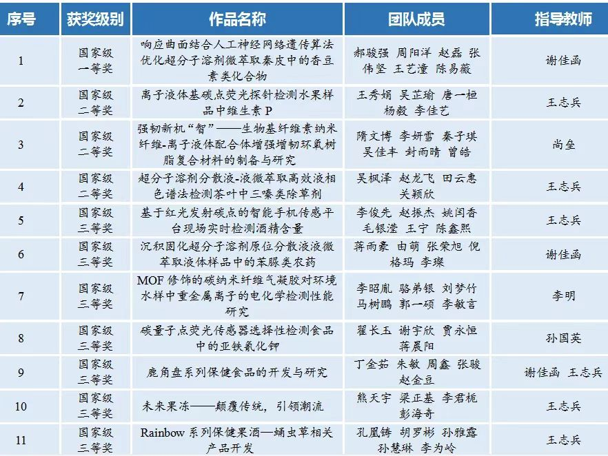 我院共有37支队伍参赛,经过前期资格审查、网络评审、省赛环节,我院有两支队伍进入决赛,决赛采取现场答辩的方式进行,由现场汇报、评委提问、评委现场亮分等环节组成。学院参赛学生团队反复打磨完善参赛作品,在决赛中沉着冷静、思路清晰、自信应答,获得评委的认可。由我校化学与生命科学学院谢佳函老师指导,郝骏强同学带领的《响应曲面结合人工神经网络遗传算法优化超分子溶剂微萃取秦皮中的香豆素类化合物》荣获国家级一等奖,由尚垒老师指导、隋文博同学带领的《强韧新机“智”——生物基纤维素纳米纤维-离子液体配合体增强增韧环氧树脂复合材料的制备与研究》等3项作品荣获国家级二等奖,由孙国英老师指导、翟长玉同学带领的《碳量子点荧光传感器选择性检测食品中的亚铁氰化钾》等7项作品荣获国家级三等奖。另荣获省级二等奖4项、三等奖9项。