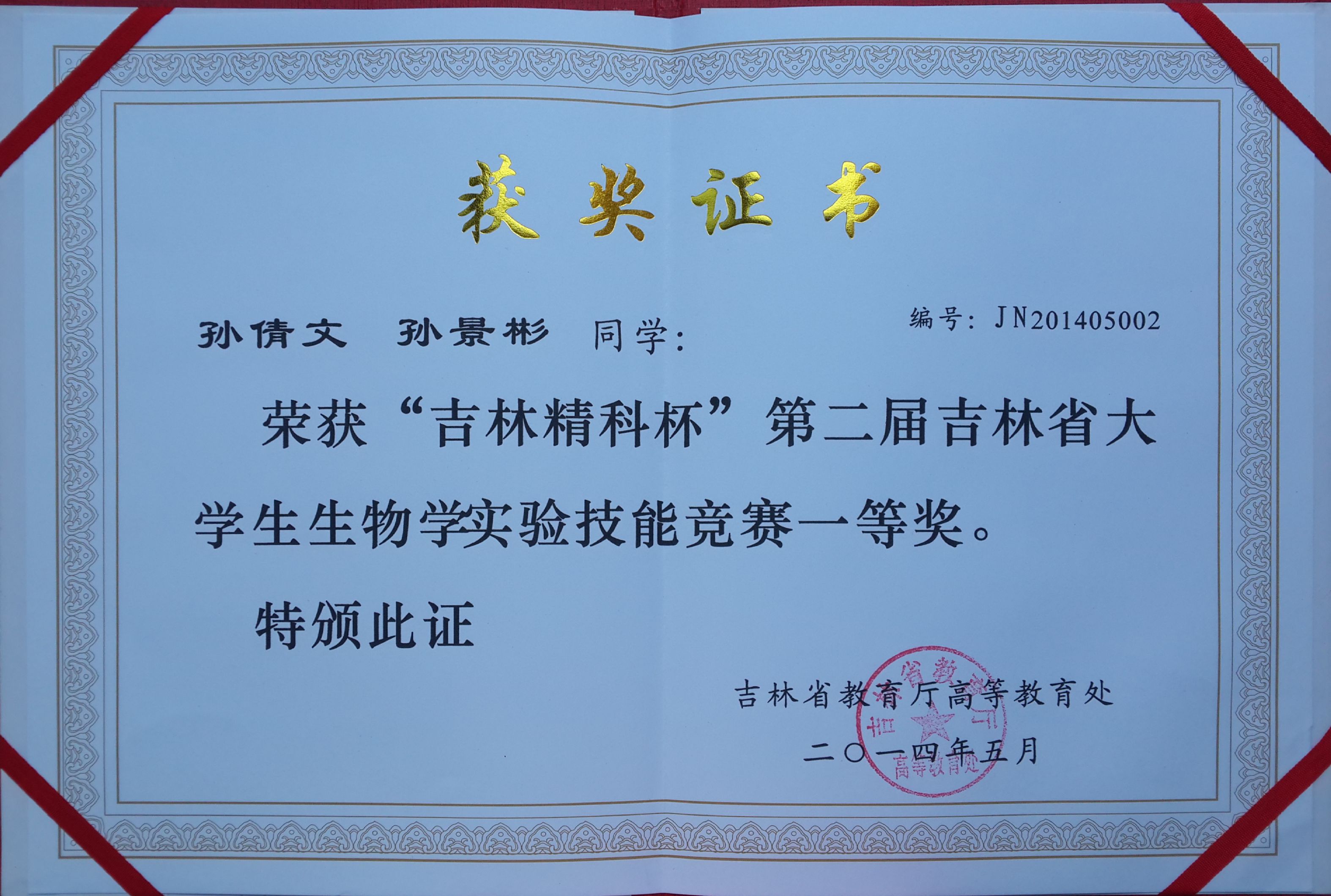 2014年“吉林精科杯”吉林省第二届大学生生物学技能竞赛一等奖(一)